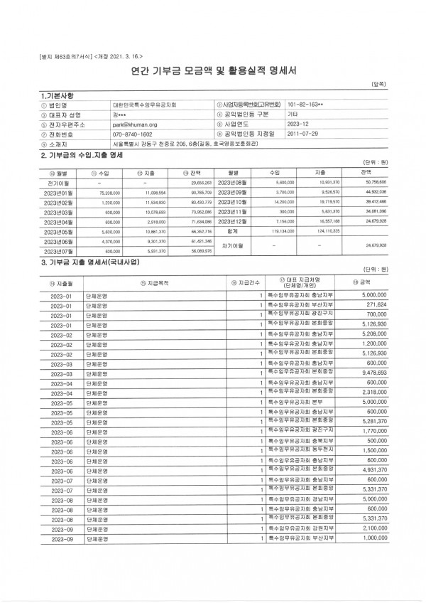 연간 기부금 모금액 및 활용실적 명세서 공개 페이지 정보 작성자 최고관리자 작성일24-04-29 17:07 조회1,735회 댓글0건 관련링크 이전글 다음글 목록 본문 연간 기부금 모금액 및 활용실적 공개 법인세법 시행령 제39조(공익성을 고려하여 정하는 기부금의 범위 등) 제5항 3호 가목 및 본회 정관 제33조(재정) 제2항에 의거 본회의 연간 기부금 모금액 및 활용실적을 공개합니다.2024. 4. 29대한민국특수임무유공자회 * 아래 표를 클릭하시면 크게 보실 수 있습니다. 이전글 다음글 목록